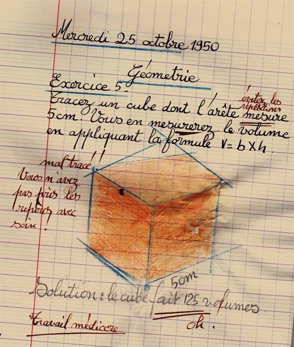 - Maître, l'expression "Excès de soin" eut été plus approprié. En effet, après s'être aperçu du non parallélisme de son tracé, l'accusé, vous tenant en haute estime, ne voulut pas vous infliger l'inexcusable rencontre des droites parallèles. RÉSULTAT, frénétiquement et non moins consciencieusement, il gomma. Maître, avez-vous au cours de votre vie tenté de gommer du papier sournoisement pelucheux ? Il cotonne, il floconne, il duvette et SE TROUE... Face à cet irréversible échec, DILEMME ! Soit l'accusé arrache la page du Cahier du Jour, sacrilège suprême car quelque part il est écrit "DU CAHIER DU JOUR AUCUNE PAGE NE SUBTILISERAS", soit il prend l'initiative de tracer à nouveau ce grumbble de foutu cube, sur du papier troué (en priant Ste Encre Épaisse de bien vouloir combler le vide) et non glacé (en priant Ste Encre Liquide de cesser de baver). Conclusion, par respect pour vous maître en particulier et pour la Perspective cavalière en général, l'accusé a tout mis en œuvre pour minimiser les dégâts. Aussi je vous enjoins d'effacer la mention "manque de soin...gna, gna, gna"... au moyen d'une gomme, je vous prie.